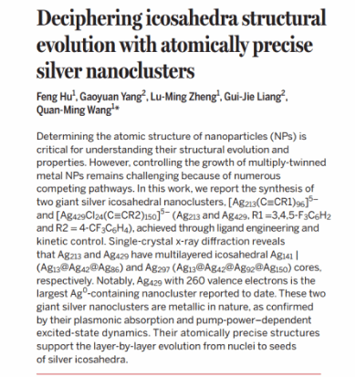 (太阳集团城网站2018 通讯员 刘星辰)近日,我校太阳集团城网站2018梁桂杰教授参与合作的研究论文《Deciphering icosahedra structural evolution with atomically precise silver nanoclusters》在《Science》期刊上正式发表(Science, 389, 6763: 921–924)。此为我校教师首次在国际顶级学术期刊《Science》上发表论文,清华大学与湖北文理学院为共同作者单位。